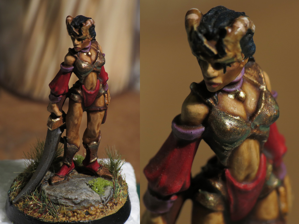 Modified female warrior (tiefling), 28mm. Shot taken with a SX-50 HS camera equipped with a Raynox DCR-250 macro lens.
