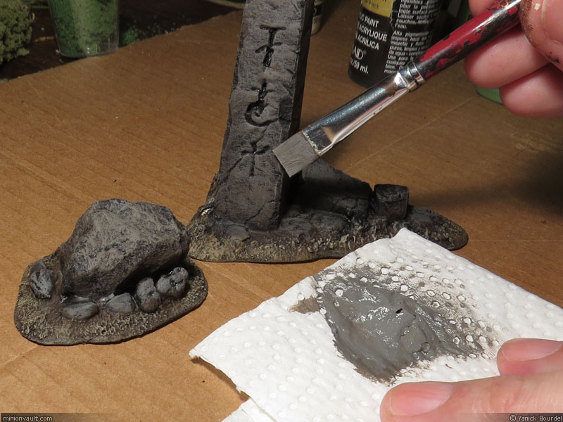 Step 6- For the stones, I made a 50/50 mix of Burnt Umber and Medium Grey and painted most of their surfaces with it, leaving just a bit of the black basecoat showing through (this greyish-brown covers approximately 90% of the stones).