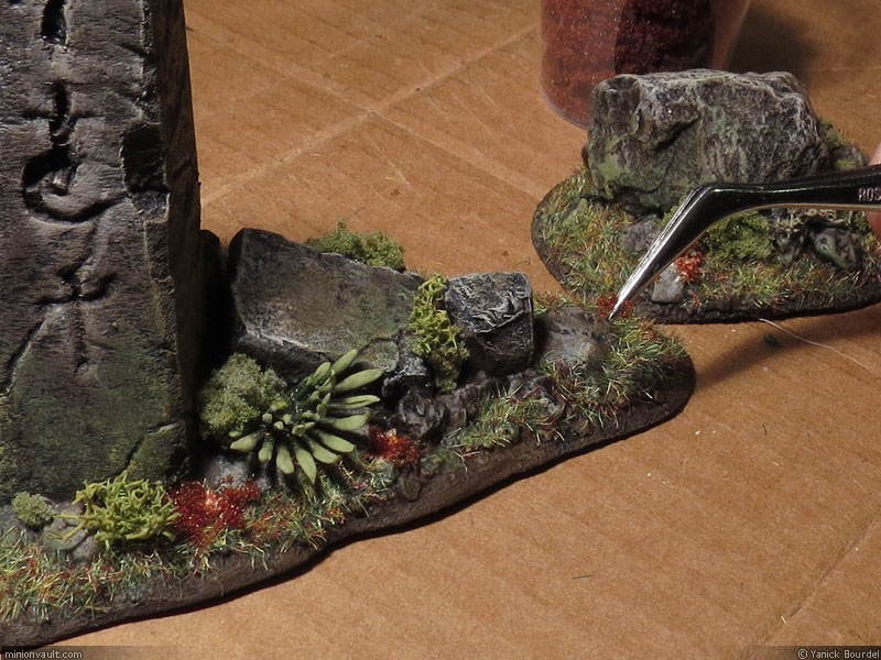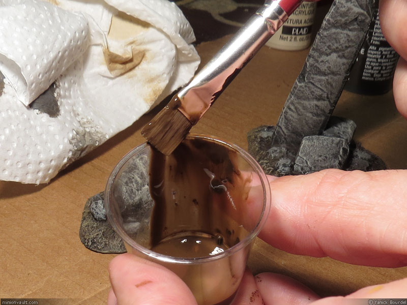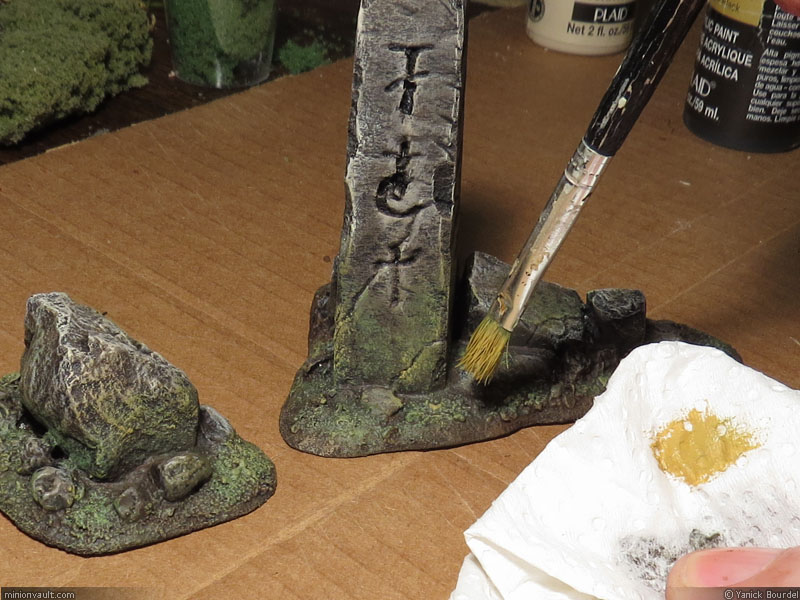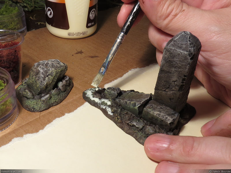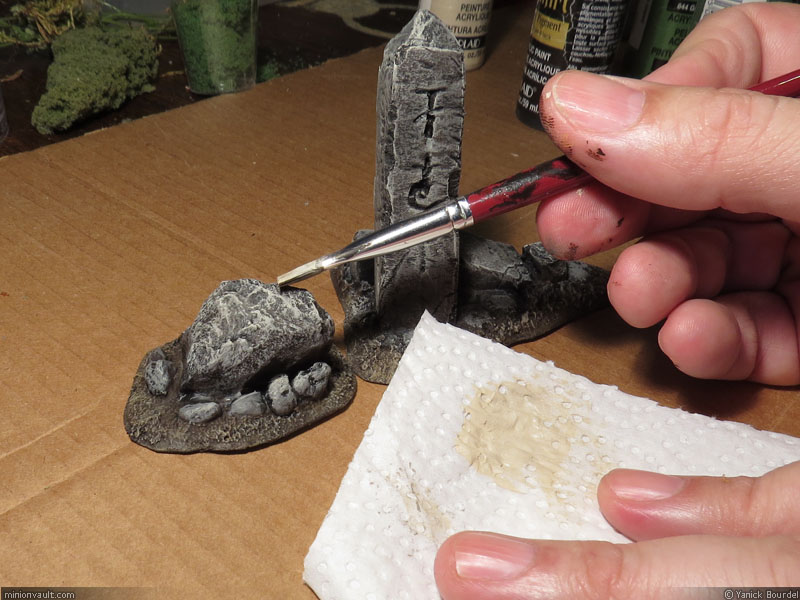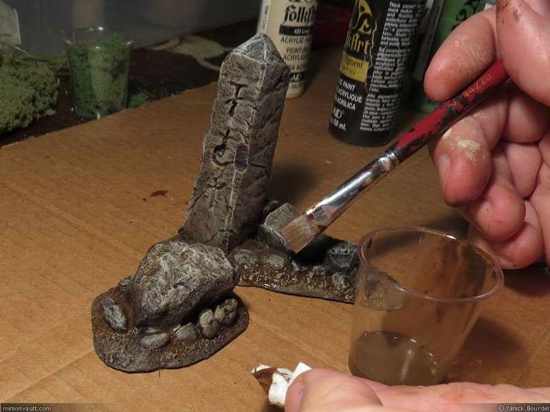 Step 9- To help blend everything together, I prepared a thin mix of 25% Burnt Umber and 75% water. I then brushed this runny “juice” over the whole terrain (ground and stones) and used a clean paper towel to wipe of the excess. This puts back a touch of earth tones to every colors, perfect for outdoors or nature based terrain.