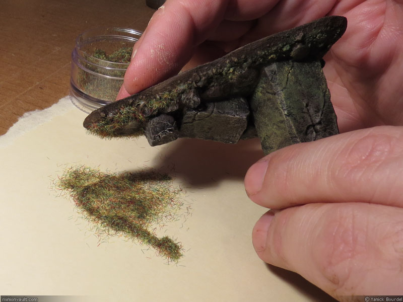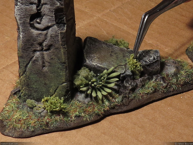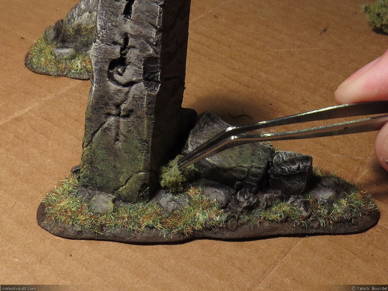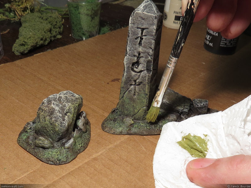 Step 12- Using a 50/50 mix of Clover green and Burnt Umber, I dry-brushed the base of the stones and some spots on the ground. This is to simulate moss and vegetation stains on the underside and bottom part of rocks, as well as underneath the places where I am planning to put some grass and plants.