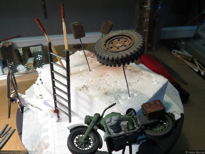 Various bits for the rubbles: a ladder, german jerrycans, pipes and a motorcycle. The motorcycle will need more attention (chipping, washes, pigments for the tires…)