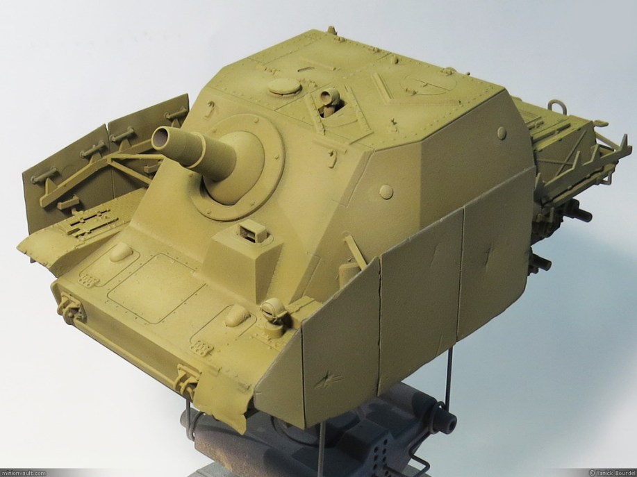 Grey primer, followed by pre-shading with black, then a basecoat of Tamiya “Dark Yellow” (Dunkelgelb). Then, some highlights of a paler shade of Dunkelgelb.