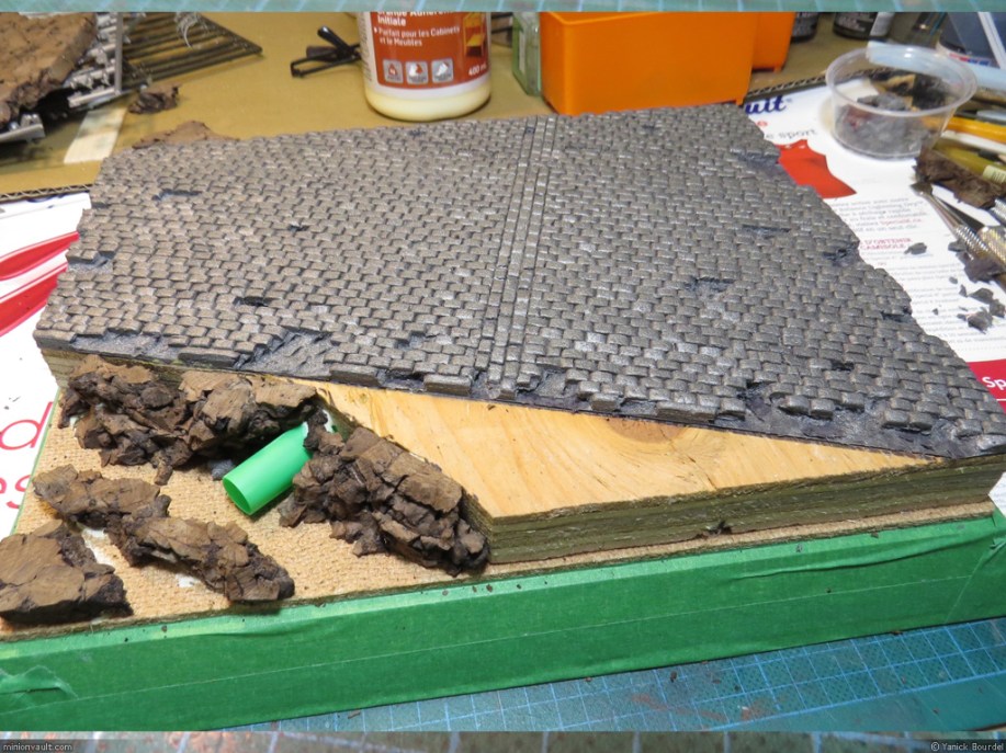 I removed some individual stones from the road to damage it. Then pieces of cork were glued on the “crater” part of the diorama.
