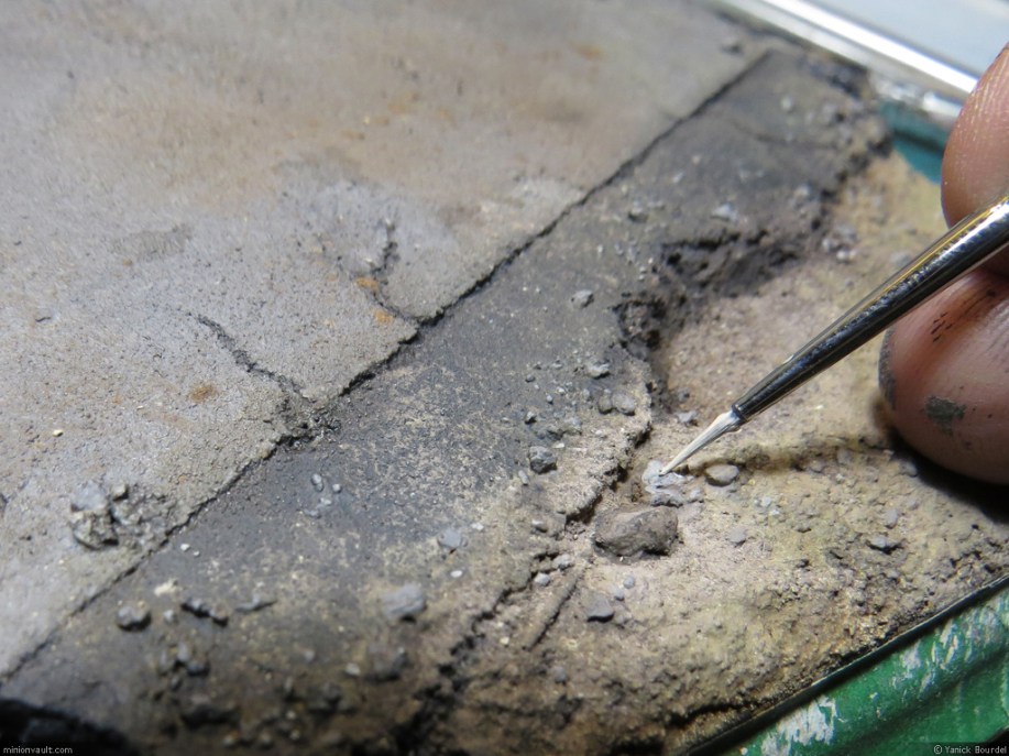 First, a wash of earth brown and sand colors. Followed by a dusting in various pigments. The whole thing was then held in place with fixative. Then I painted the rocks various shades of grey and beige to make them pop.