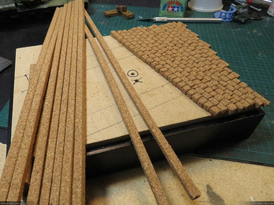 Strips of cork. I cut them in small “bricks”, sanded the edges and glued them one by one. I took A LONG TIME! But the end result is very good.