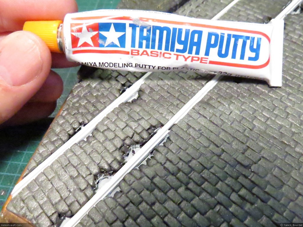 The manhole cover, the drain grid and the tram rails were given a brown coat, followed by rust and pale dust pigments with a final metallic highlight (dry-bushing with gun-metal acrylic).